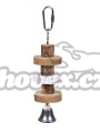 Trixie závěsná hračka pro větší papoušky seskládaná z dřevěných koleček, lávového kamene a zvonečku. Lávový kámen je důležitý na obrušování zobáku. Hračka se upevní do klece pomocí karabiny s bezpečnostním zámkem.